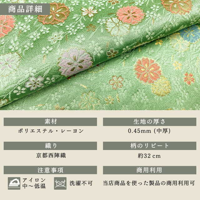 フレッシュグリーンの地にオレンジやパープル、パステルブルーの桜模様が織り込まれた生地は、大人から子どもまで幅広い世代に親しまれています。インテリアや土産品、ペット用衣装など、多様な分野で活用されています。