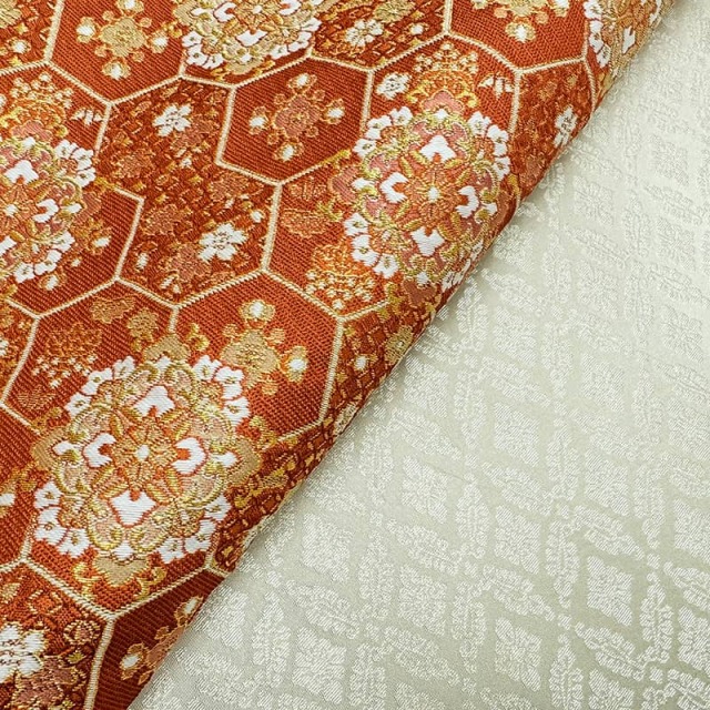 オレンジの華やかな織物生地に伝統的な亀甲文様と草花が華やかに配された金襴生地は、上品な光沢と重厚感ある風合いから、大人から子どもまで幅広い世代に親しまれています。
