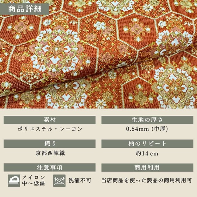 金らんと呼ばれるこの和模様の布地は、色や柄によって、かっこいい、かわいい、エキゾチック、オリエンタル、豪華、高級といった多彩な印象を演出できます。職人の技術が詰まった逸品で、和風衣装やインテリア装飾など幅広い用途に応用できます。