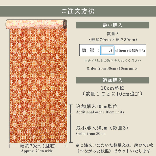 巾70cm×長さ30cm → 数量「3」巾70cm×長さ70cm → 数量「7」 巾70cm×長さ2m50cm → 数量「25」 と長さ10cm延長ごとに数量を1ずつ増やし入力ください。 恐れ入りますが、最低単位は30cm (数量3)からとなります。数量は「3」以上でお願いいたします。