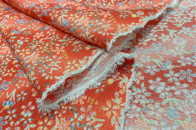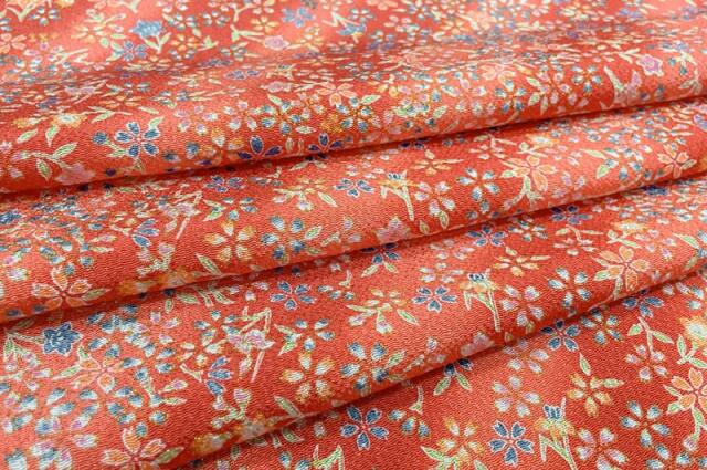 茜色の野原に可憐な小花が一面に咲き誇り、夕暮れの野に陽があたり花々が煌めくような上品で華やかな縮緬生地です。
