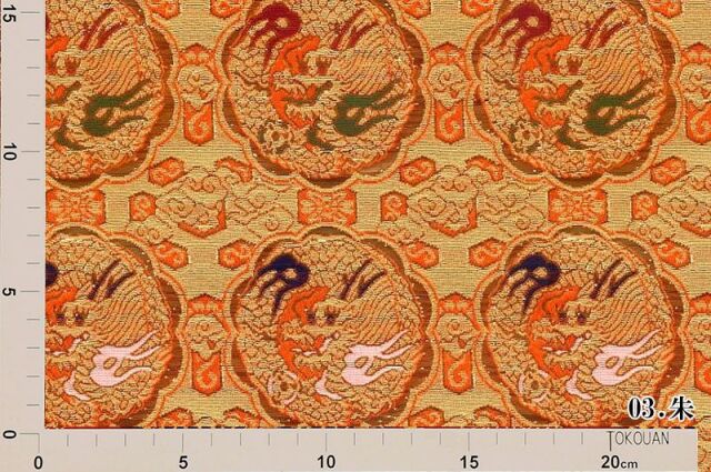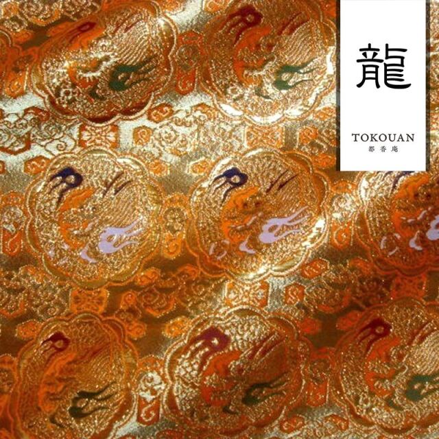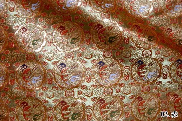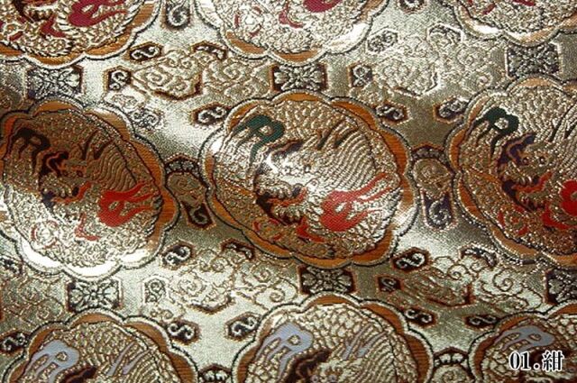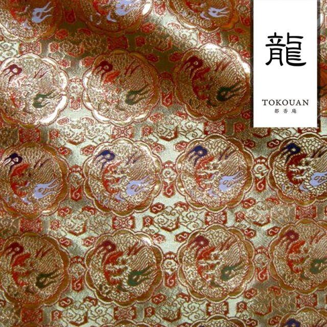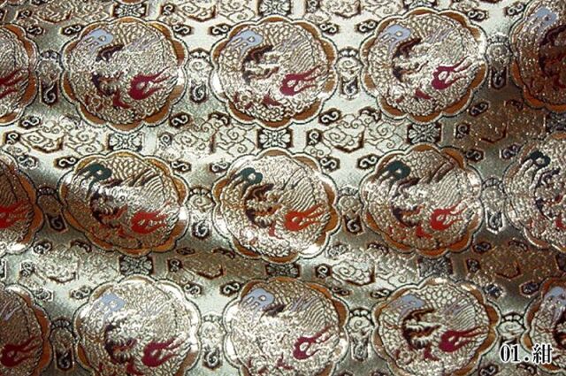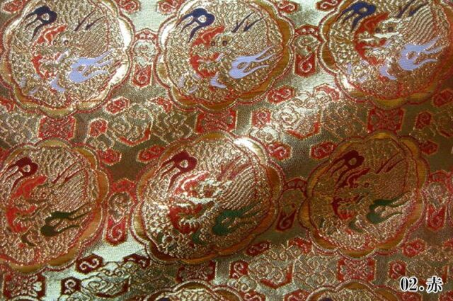 ゴールドカラーの糸を豊富に使用した織地に、レッド、ホワイト、グリーン、ネイビー系などの様々な色で丸龍を織り出した金襴生地で、大人の趣味から、お子様や園児、学生まで、幅広い層にご利用頂けます。宮司や僧侶など、伝統的な職業の方々にも重宝されているほか、インテリアやお土産品を製造する土産品製造者や工務店の方々にも人気の素材です。犬の服や小物にも使用されることから、ペット用のアパレルにも応用可能です。