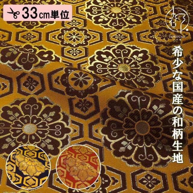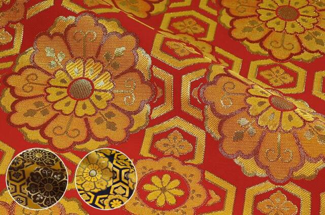 こちらの和柄生地は、赤色、紺色、茶系の3色展開の織地に、亀甲で繋いだ大きな華文を配した、優雅な金襴生地です。大人っぽくも可愛らしく、どんなシーンでも使いやすい生地です。