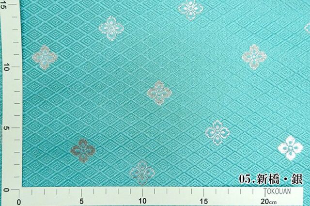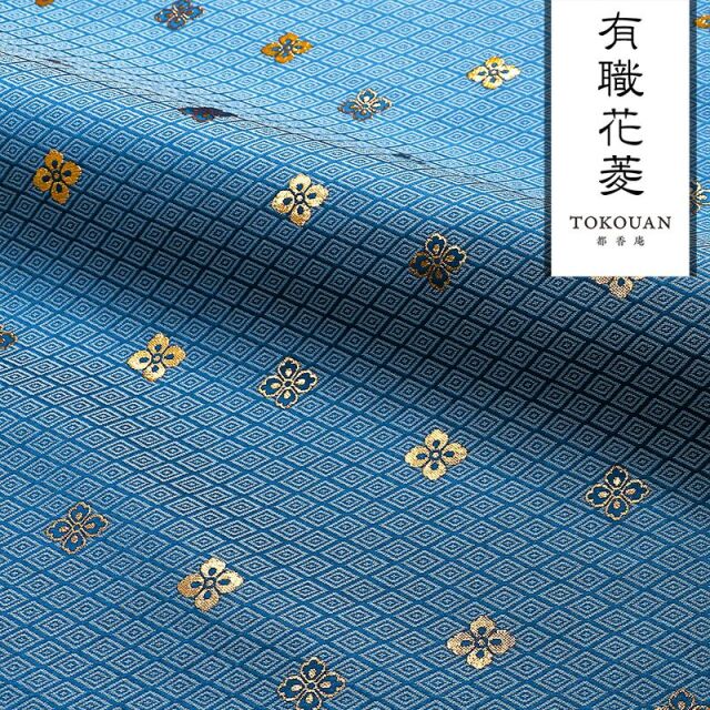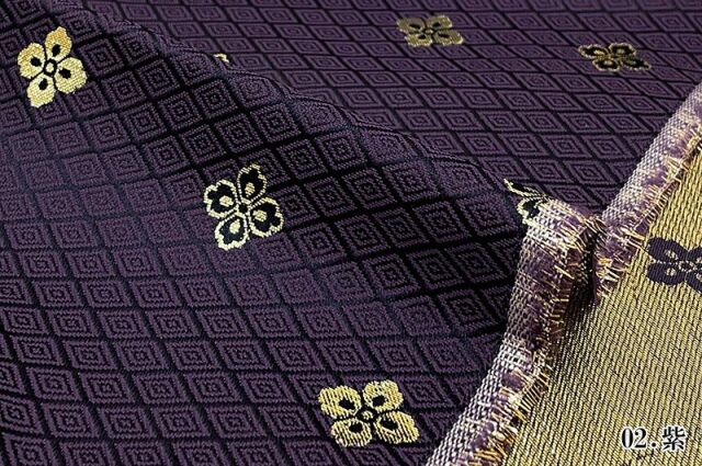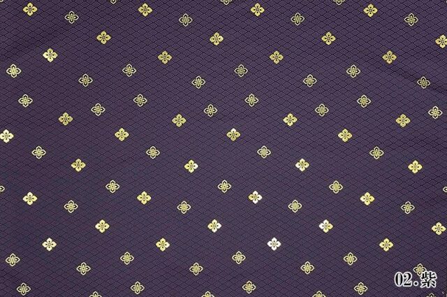 織地は、ブラック、レッド、ホワイト、グリーン、パープル、ブルー、ゴールド、新橋色(明るいグリーン調のブルー)などの7色展開です。ゴールドカラーやシルバーカラーの花菱紋が、特徴的な金襴生地で、大人の趣味から、お子様や園児、学生まで、幅広い層にご利用頂けます。宮司や僧侶など、伝統的な職業の方々にも重宝されているほか、インテリアやお土産品を製造する土産品製造者や工務店の方々にも人気の素材です。犬の服や小物にも使用されることから、ペット用のアパレルにも応用可能です。