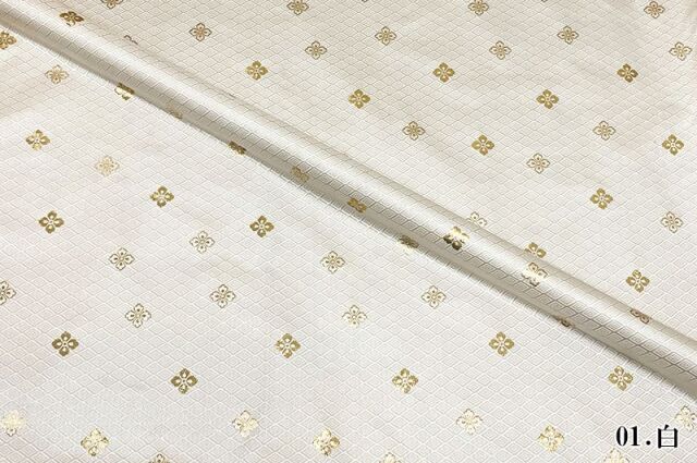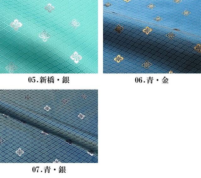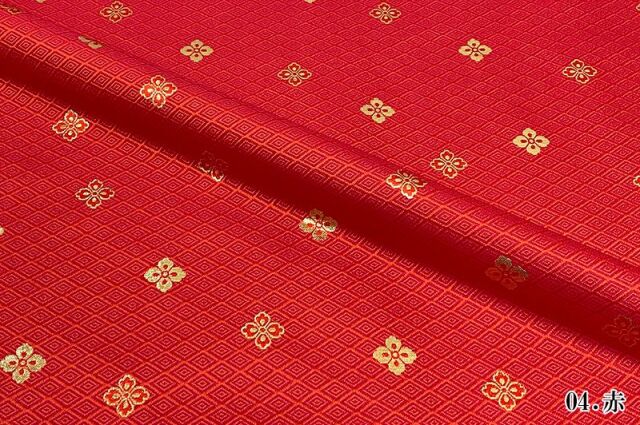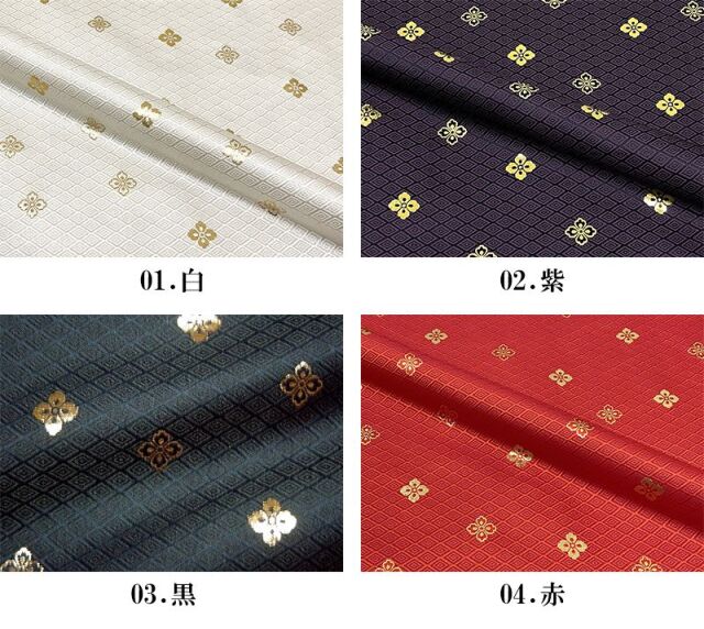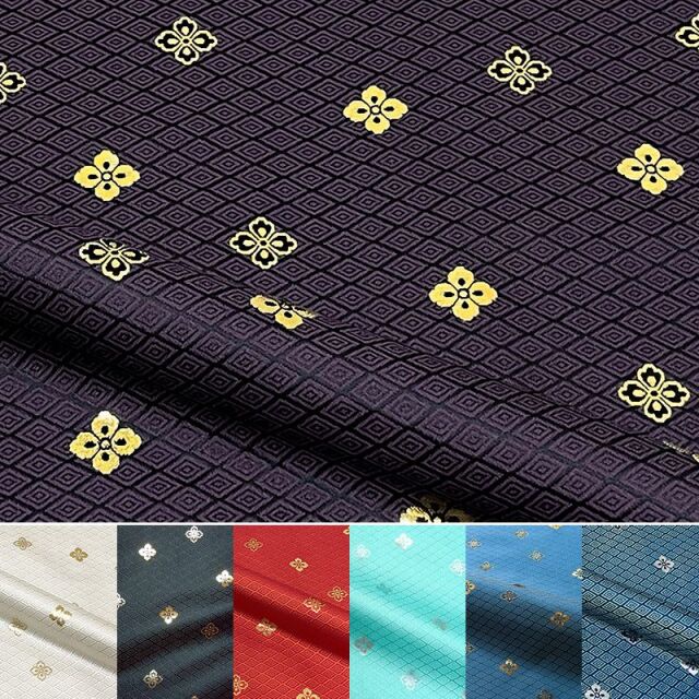 こちらの和柄生地は、黒色、赤色、白色、紫色、青色、金色、新橋色(明るい緑がかった青色)などの7色展開の織地で、金色や銀色の花菱紋が、特徴的な金襴生地です。どんなシーンでも使いやすい生地です。