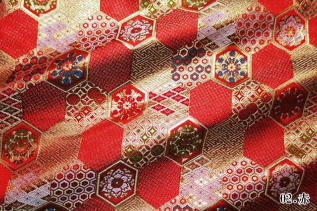 こちらの和柄生地は、赤色、紺色の2色展開の織地で、亀甲文様が配された、重厚感ある金襴生地です。どんなシーンでも使いやすい生地です。
