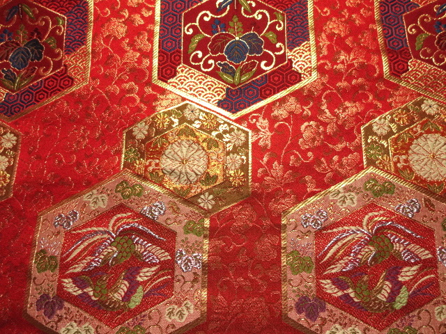 亀甲の中に菊や鳳凰を配した重厚感ある文様の金襴です。