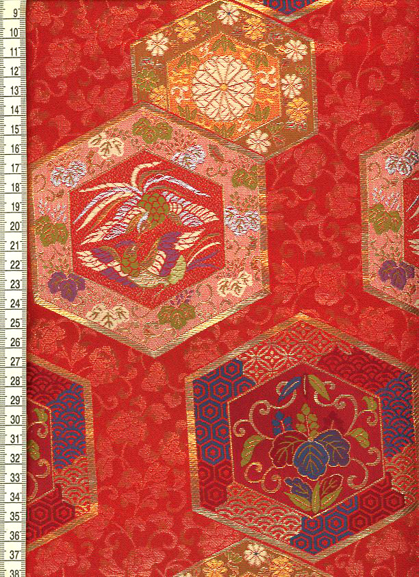 こちらの和柄生地は、赤色の織地に、亀甲文様や、菊、鳳凰などを配した重厚感ある金襴生地です。どんなシーンでも使いやすい生地です。