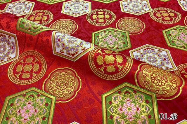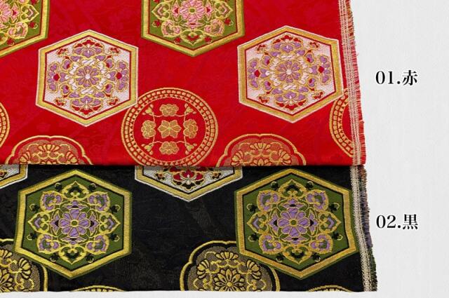 織地は、レッド、ブラックの2色展開です。亀甲文様の中に、レッドやパープルなどの華文が配された、優雅な金襴生地で、大人の趣味から、お子様や園児、学生まで、幅広い層にご利用頂けます。宮司や僧侶など、伝統的な職業の方々にも重宝されているほか、インテリアやお土産品を製造する土産品製造者や工務店の方々にも人気の素材です。犬の服や小物にも使用されることから、ペット用のアパレルにも応用可能です。