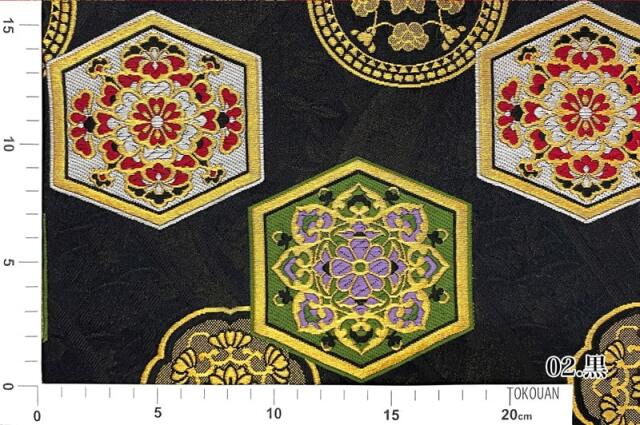 こちらの和柄生地は、赤色、黒色の2色展開の織地で、亀甲文様の中に、赤色や紫色などの華文が配された、優雅な金襴生地です。どんなシーンでも使いやすい生地です。