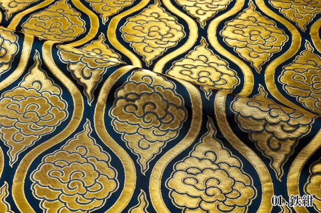 こちらの和柄生地は、鉄紺色(わずかに緑みを帯びた暗い青色)、黒色、濃紺色の3色展開の織地で、立涌文様の中に、金糸の雲を配した、優雅な金襴生地です。どんなシーンでも使いやすい生地です。