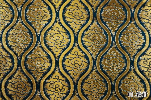 織地は、鉄紺色(グリーン調のダークブルー)、ブラック、ダークネイビーの3色展開です。立涌文様の中に、金糸の雲を配した、優雅な金襴生地で、大人の趣味から、お子様や園児、学生まで、幅広い層にご利用頂けます。宮司や僧侶など、伝統的な職業の方々にも重宝されているほか、インテリアやお土産品を製造する土産品製造者や工務店の方々にも人気の素材です。犬の服や小物にも使用されることから、ペット用のアパレルにも応用可能です。