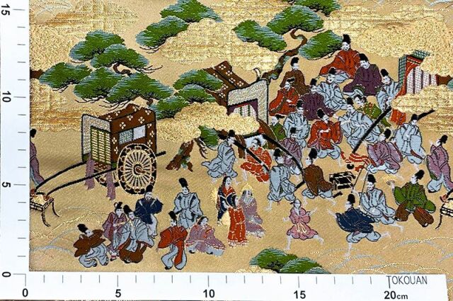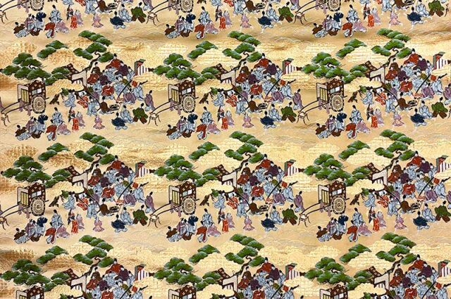 こちらの和柄生地は、上品なベージュの織地に、平安時代の京都の風景を賑やかに配した、金襴生地です。どんなシーンでも使いやすい生地です。