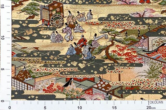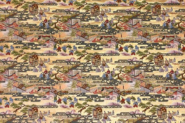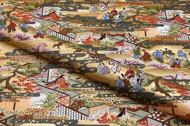 こちらの和柄生地は、上品なベージュの織地に、平安時代の貴族達の優雅な風景を配した、金襴生地です。どんなシーンでも使いやすい生地です。