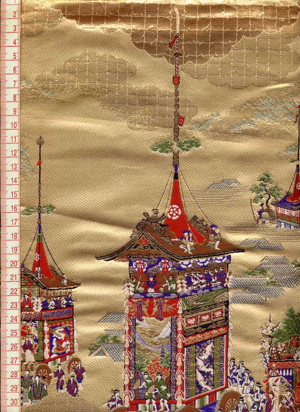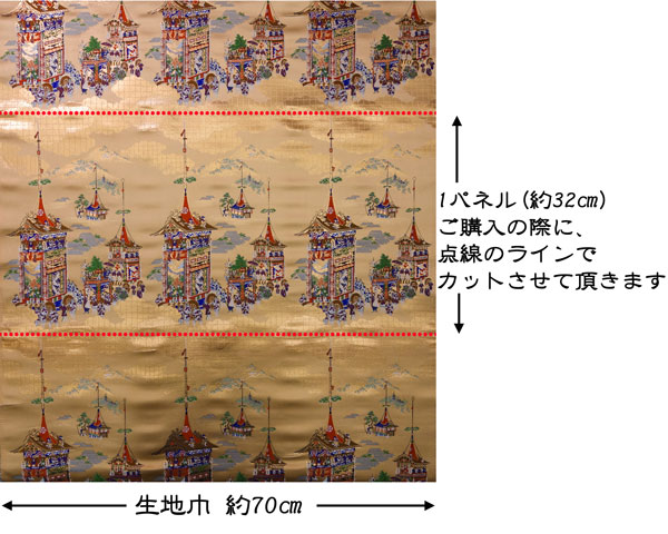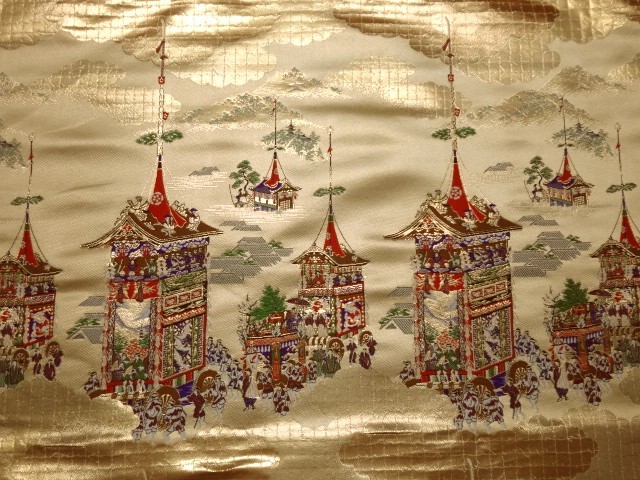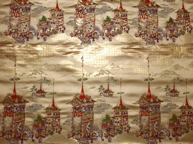 こちらの和柄生地は桑染めの織地に日本伝統のお祭りの様子を織り出した大変緻密な金襴生地です。大きな柄ですのでインテリアとしての利用がお薦めです。