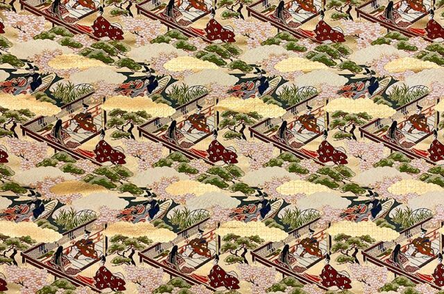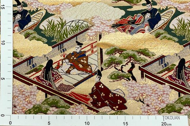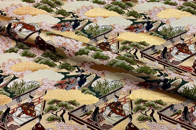 こちらの和柄生地は、上品なベージュの織地に、平安時代の貴族達の優雅な風景を配した、金襴生地です。どんなシーンでも使いやすい生地です。