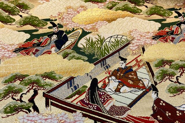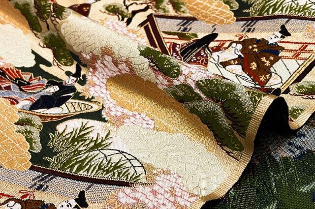 風景の中に公家に関係のある王朝風の雅な文様を配した優雅で上品な織物です。