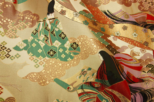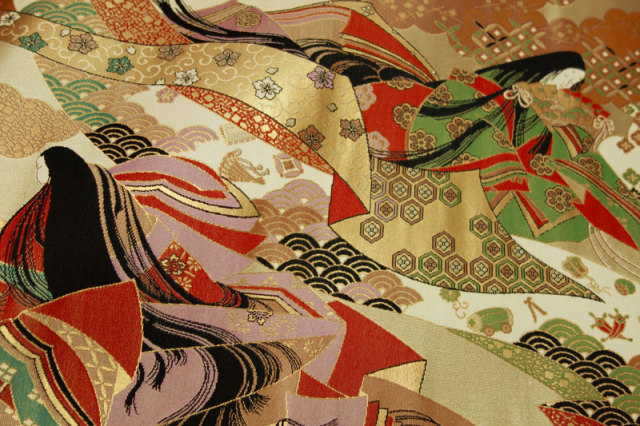 源氏物語を題材に、全体的に流れのある柄の中に人物が細密に織り上げられた金襴生地です。