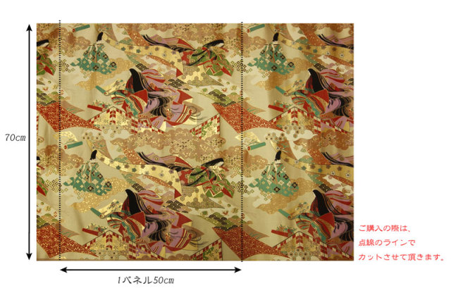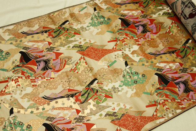 こちらの和柄生地は、上品なベージュの織地に、平安時代の貴族達の優雅な風景を配した、金襴生地です。どんなシーンでも使いやすい生地です。