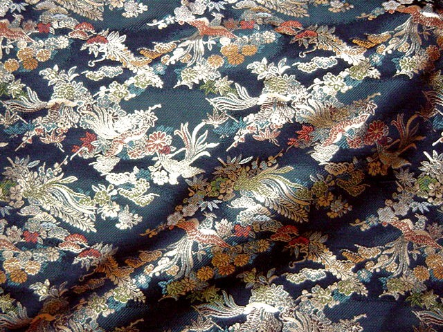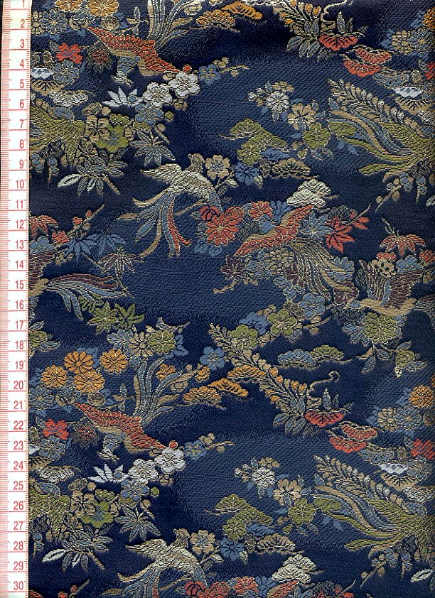 上品なネイビーの織地に、レッド、ブルー、ホワイトなどの色で織り出された鳳凰が舞う、優雅な金襴生地で、大人の趣味から、お子様や園児、学生まで、幅広い層にご利用頂けます。宮司や僧侶など、伝統的な職業の方々にも重宝されているほか、インテリアやお土産品を製造する土産品製造者や工務店の方々にも人気の素材です。犬の服や小物にも使用されることから、ペット用のアパレルにも応用可能です。