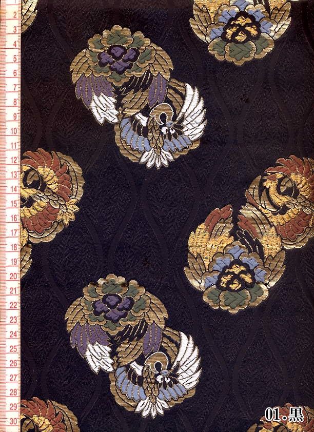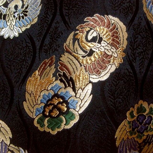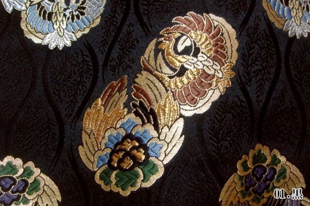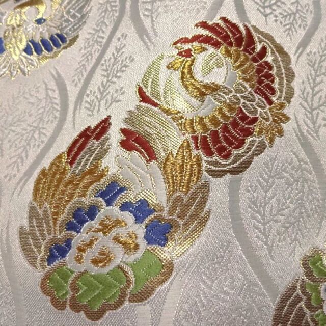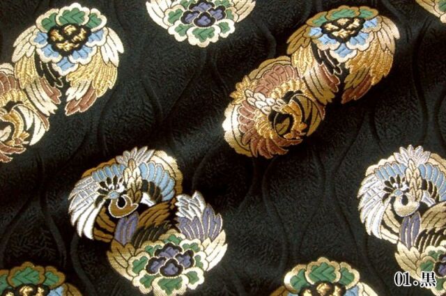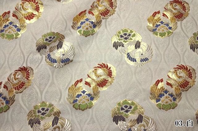 ブラック、パープル、ホワイト系の3色展開の織地に、レッド、ブルー、グリーン、ゴールドカラーの糸で織り出された鳳凰が舞う金襴生地で、大人の趣味から、お子様や園児、学生まで、幅広い層にご利用頂けます。宮司や僧侶など、伝統的な職業の方々にも重宝されているほか、インテリアやお土産品を製造する土産品製造者や工務店の方々にも人気の素材です。犬の服や小物にも使用されることから、ペット用のアパレルにも応用可能です。