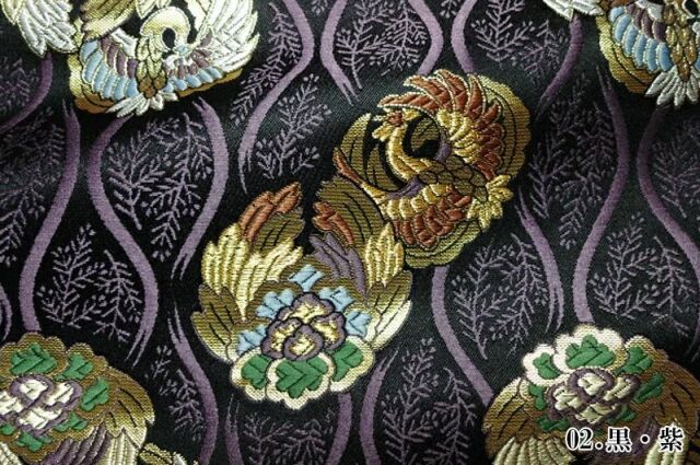 こちらの和柄生地は、黒、紫、白系の3色展開の織地に、赤、青、緑、金色の糸で織り出された鳳凰が舞う、金襴生地です。どんなシーンでも使いやすい生地です。