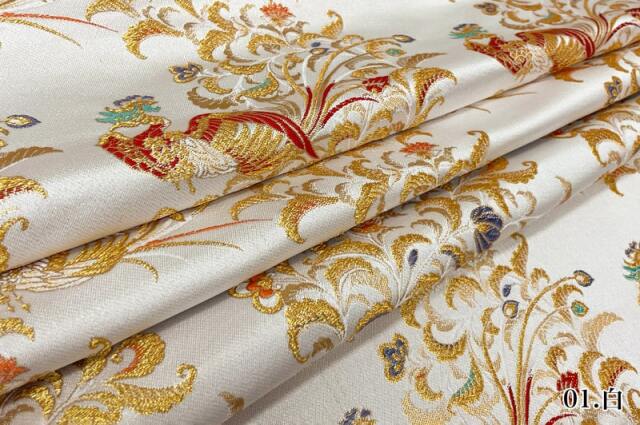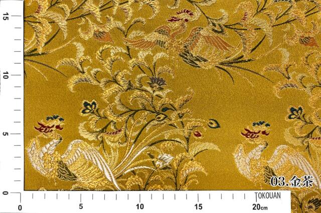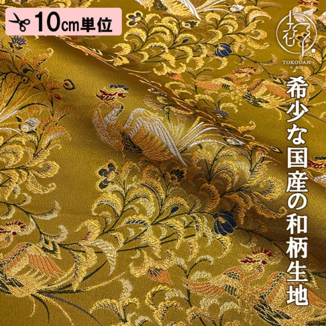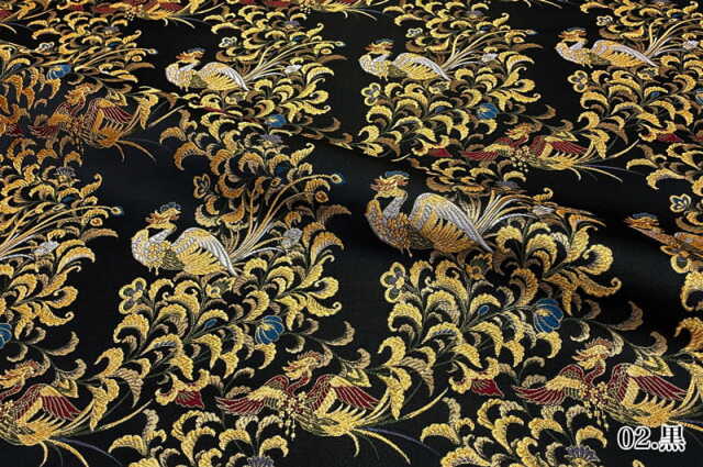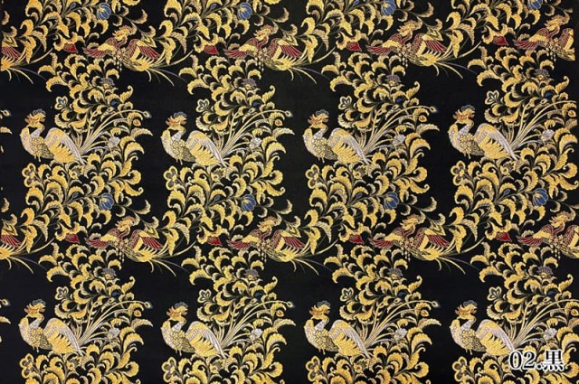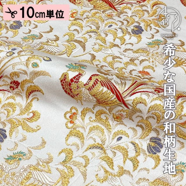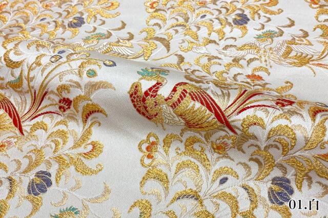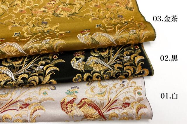 ホワイト、ブラック、ゴールドの織地に、吉祥文様の鳳凰を織り出した金襴生地で、大人の趣味から、お子様や園児、学生まで、幅広い層にご利用頂けます。宮司や僧侶など、伝統的な職業の方々にも重宝されているほか、インテリアやお土産品を製造する土産品製造者や工務店の方々にも人気の素材です。犬の服や小物にも使用されることから、ペット用のアパレルにも応用可能です。