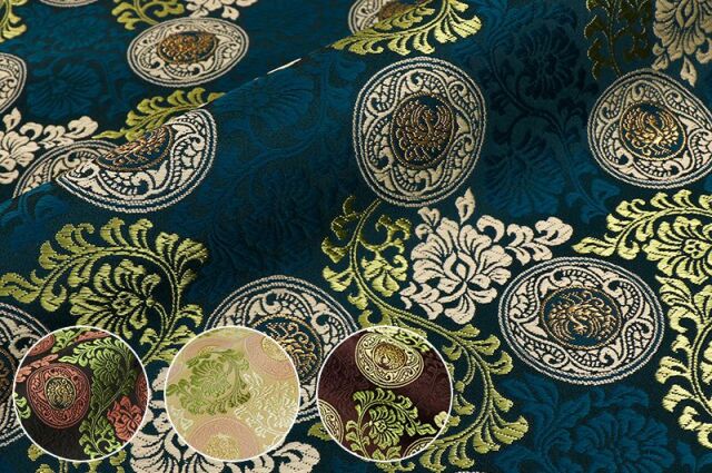 金らんと呼ばれるこの和模様の布地は、色や柄によりかっこいい、かわいい、エキゾチック、オリエンタル、豪華、高級、と印象が変わります。職人の技が詰まった一品で、和風の衣装やインテリアの装飾など多岐にわたる用途に応用できます。