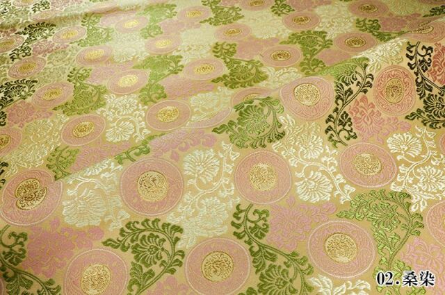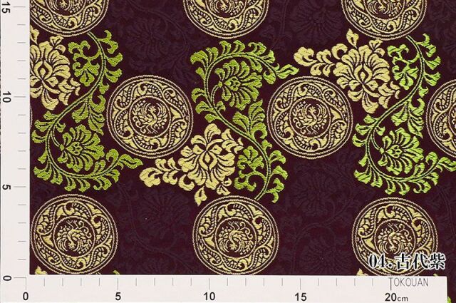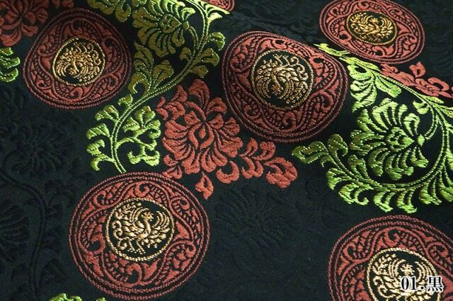 ブラック、パープル、ネイビー、鈍いイエロー系の織地に、唐花や鳳凰の図柄を織り出した4色展開で、大人の趣味から、お子様や園児、学生まで、幅広い層にご利用頂けます。宮司や僧侶など、伝統的な職業の方々にも重宝されているほか、インテリアやお土産品を製造する土産品製造者や工務店の方々にも人気の素材です。犬の服や小物にも使用されることから、ペット用のアパレルにも応用可能です。