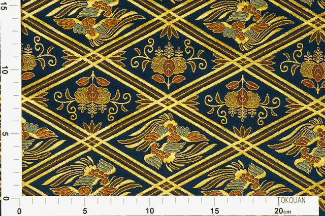複数の斜め線が交差した幾何的な襷文の中に、鳳凰と花を織り込んだ金襴生地です。
