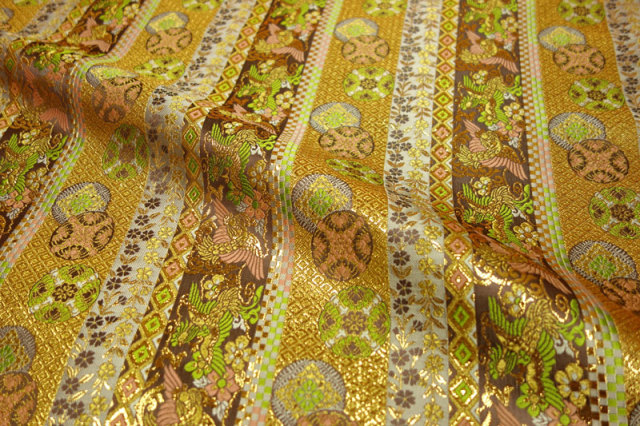 小花と吉祥文様が織り込まれた縦縞に、羽ばたく鳳凰が織りだされた金襴生地です。