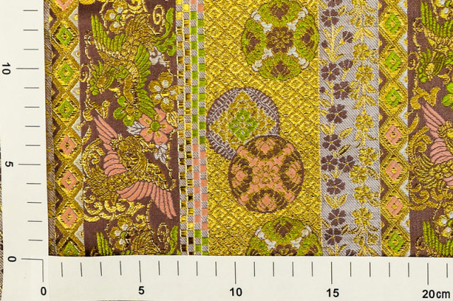 ッド、イエロー、グリーンの小花や吉祥文様が織り込まれた縦縞に、縁起の良い鳳凰が織り込まれた金襴生地で、大人の趣味から、お子様や園児、学生まで、幅広い層にご利用頂けます。宮司や僧侶など、伝統的な職業の方々にも重宝されているほか、インテリアやお土産品を製造する土産品製造者や工務店の方々にも人気の素材です。犬の服や小物にも使用されることから、ペット用のアパレルにも応用可能です。