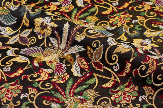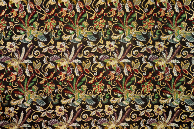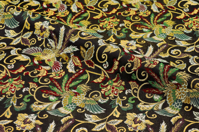 こちらの和柄生地は、黒色の織地に、赤、黄、緑、青色系など、色とりどりの花々のまわりを、鳳凰が舞う優雅な金襴生地です。どんなシーンでも使いやすい生地です。