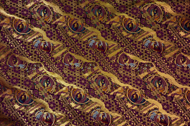 上品なパープルの織地に、レッド、グリーン、ブルー、ライトブルー、オレンジ、ゴールドカラーなどで織り出された鳳凰が籠目文を舞う、優雅な金襴生地で、大人の趣味から、お子様や園児、学生まで、幅広い層にご利用頂けます。宮司や僧侶など、伝統的な職業の方々にも重宝されているほか、インテリアやお土産品を製造する土産品製造者や工務店の方々にも人気の素材です。犬の服や小物にも使用されることから、ペット用のアパレルにも応用可能です。