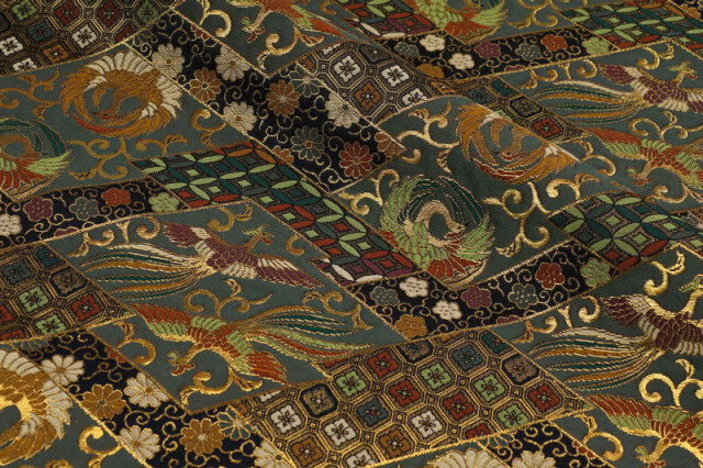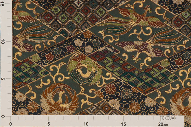 暗めのグリーン系色の織地に、レッド、グリーン、ホワイト、ゴールドカラーで織り出された鳳凰が舞う、優雅な金襴生地で、大人の趣味から、お子様や園児、学生まで、幅広い層にご利用頂けます。宮司や僧侶など、伝統的な職業の方々にも重宝されているほか、インテリアやお土産品を製造する土産品製造者や工務店の方々にも人気の素材です。犬の服や小物にも使用されることから、ペット用のアパレルにも応用可能です。