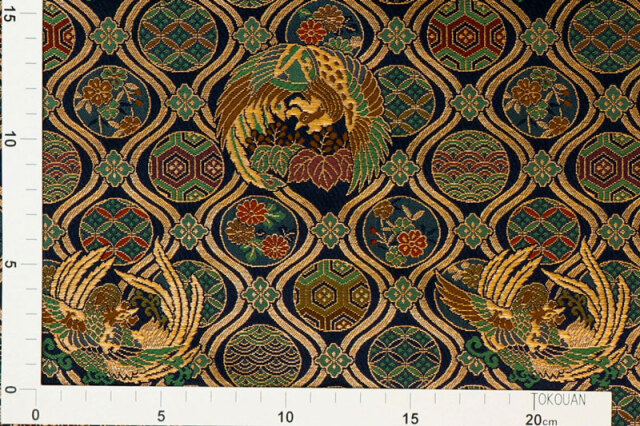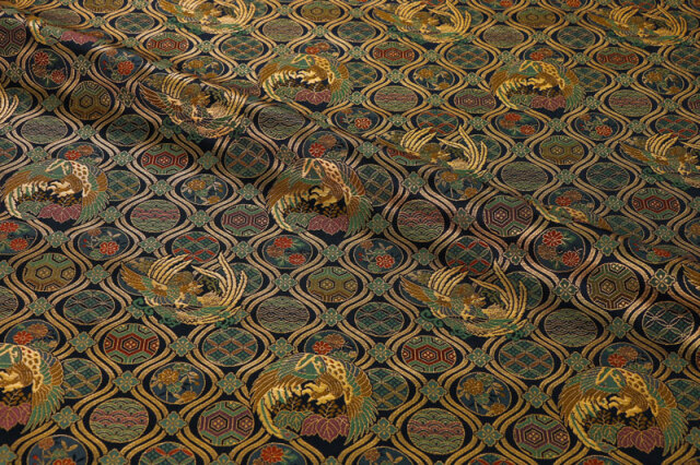 暗めのネイビーカラーの織地に、レッド、グリーン、ゴールドカラーで織り出された鳳凰が舞う、優雅な金襴生地で、大人の趣味から、お子様や園児、学生まで、幅広い層にご利用頂けます。宮司や僧侶など、伝統的な職業の方々にも重宝されているほか、インテリアやお土産品を製造する土産品製造者や工務店の方々にも人気の素材です。犬の服や小物にも使用されることから、ペット用のアパレルにも応用可能です。