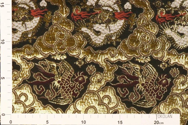 ブラックの織地に、ゴールドカラーの雲とホワイトの龍が配された、優雅な金襴生地で、大人の趣味から、お子様や園児、学生まで、幅広い層にご利用頂けます。宮司や僧侶など、伝統的な職業の方々にも重宝されているほか、インテリアやお土産品を製造する土産品製造者や工務店の方々にも人気の素材です。犬の服や小物にも使用されることから、ペット用のアパレルにも応用可能です。