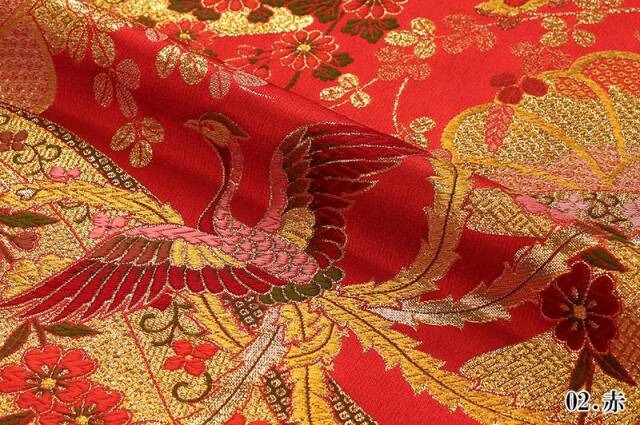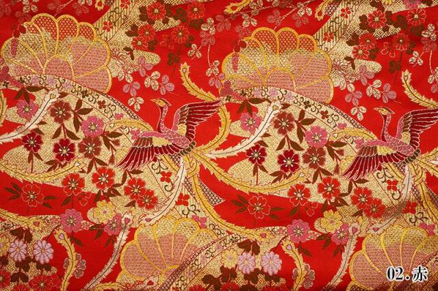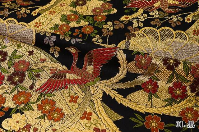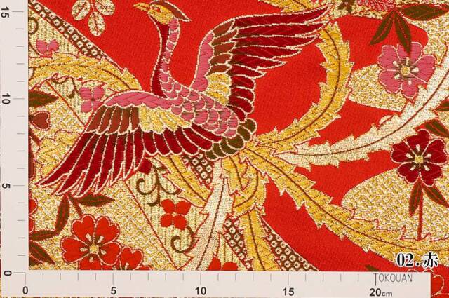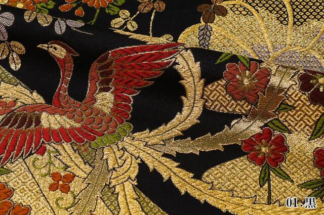 こちらの和柄生地は、黒、赤の2色展開の織地に、金色や緑色の糸で織り出された鳳凰が舞う、優雅な金襴生地です。どんなシーンでも使いやすい生地です。