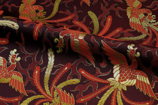 黒の地に、赤と金でシンプルに鳳凰が舞う様をを表現した金襴生地です。