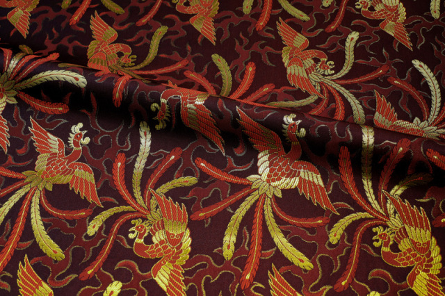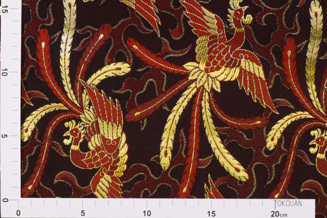 こちらの和柄生地は、黒色の織地に、赤、金色で織り出された鳳凰が舞う、優雅な金襴生地です。どんなシーンでも使いやすい生地です。