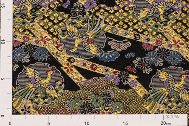 シックなブラックの織地に、ゴールドカラーの鳳凰や、レッド、ブルー、パープル、グリーンなどの花々などが散りばめられた金襴生地で、大人の趣味から、お子様や園児、学生まで、幅広い層にご利用頂けます。宮司や僧侶など、伝統的な職業の方々にも重宝されているほか、インテリアやお土産品を製造する土産品製造者や工務店の方々にも人気の素材です。犬の服や小物にも使用されることから、ペット用のアパレルにも応用可能です。