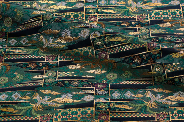 こちらの和柄生地は、淡い青、緑、金色の糸で織り出された鳳凰が舞う、金襴生地です。どんなシーンでも使いやすい生地です。