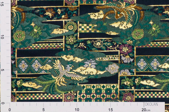 パステルブルー、グリーン、ゴールドカラーの糸で織り出された鳳凰が舞う金襴生地で、大人の趣味から、お子様や園児、学生まで、幅広い層にご利用頂けます。宮司や僧侶など、伝統的な職業の方々にも重宝されているほか、インテリアやお土産品を製造する土産品製造者や工務店の方々にも人気の素材です。犬の服や小物にも使用されることから、ペット用のアパレルにも応用可能です。