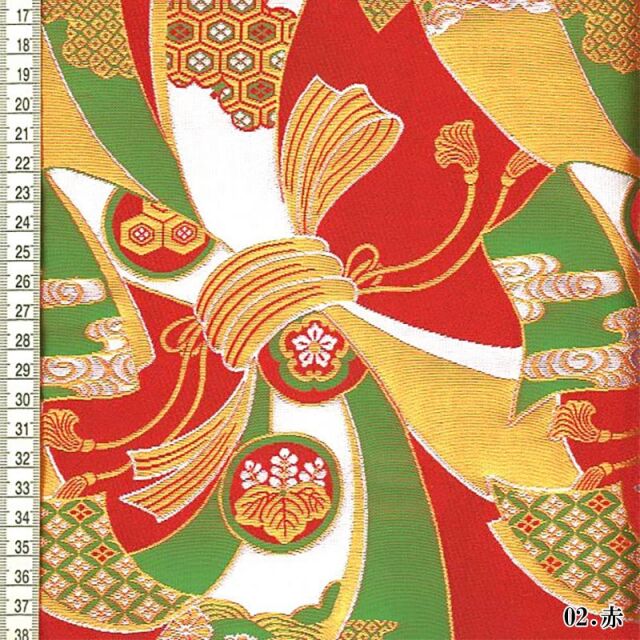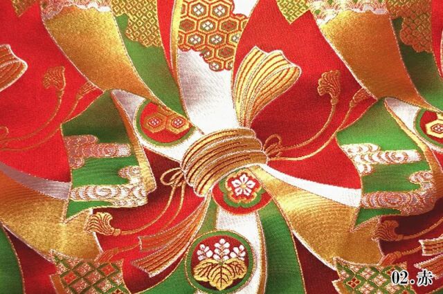 こちらの和柄生地は、華やかな赤や緑、白や紫、金色などの束ね熨斗の文様が、躍動的に描かれた金襴生地です。どんなシーンでも使いやすい生地です。