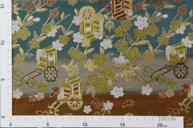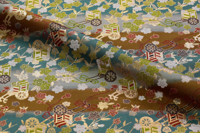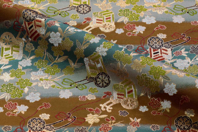 こちらの和柄生地は、茶色や青緑色の織地に、平安時代の貴族が使用した御所車の文様を配した、優雅な金襴生地です。大人っぽくも可愛らしく、どんなシーンでも使いやすい生地です。