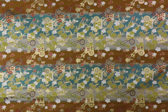 平安時代の貴族が使用した牛車を文様化した金襴生地です。