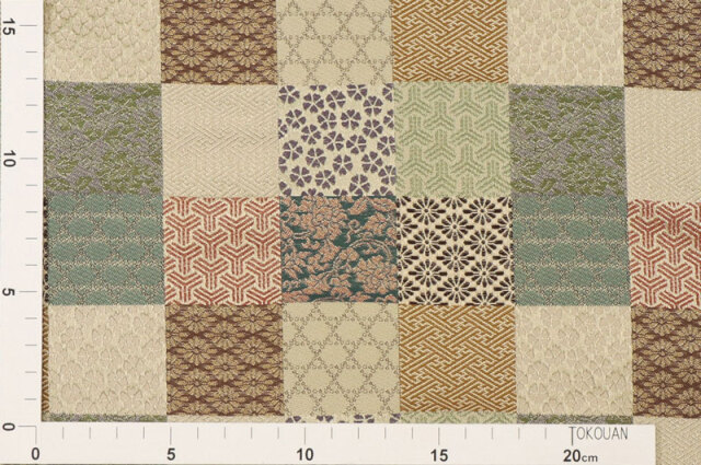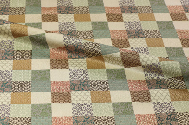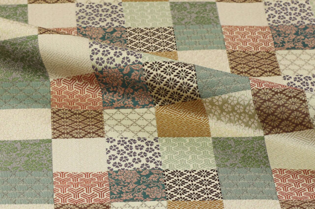 こちらの和柄生地は、赤や緑色などの石畳文様が特徴的な金襴生地です。どんなシーンでも使いやすい生地です。