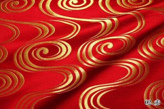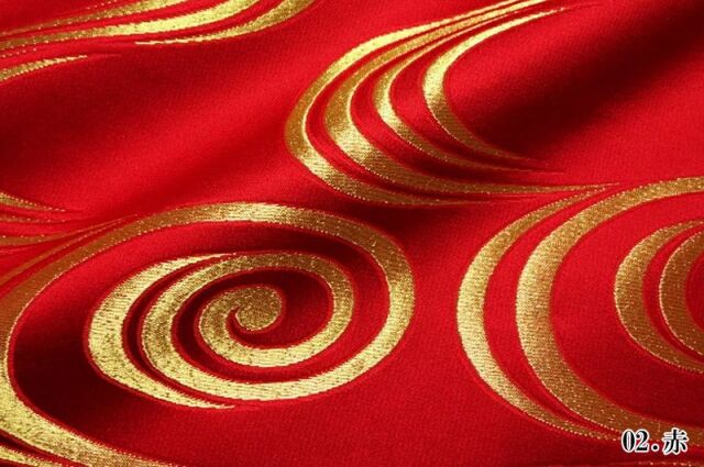 織地は、レッド、ブラックの2色展開です。ゴールドカラーの観世水の文様を織り込んだ、優雅な金襴生地で、大人の趣味から、お子様や園児、学生まで、幅広い層にご利用頂けます。宮司や僧侶など、伝統的な職業の方々にも重宝されているほか、インテリアやお土産品を製造する土産品製造者や工務店の方々にも人気の素材です。犬の服や小物にも使用されることから、ペット用のアパレルにも応用可能です。