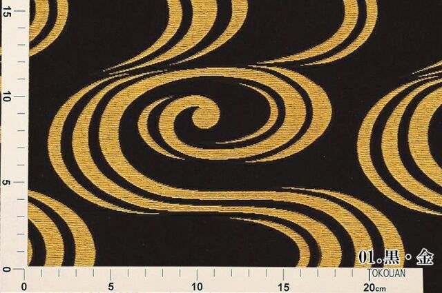 こちらの和柄生地は、赤色、黒色の2色展開の織地に、金糸で観世水の文様を織り込んだ、優雅な金襴生地です。どんなシーンでも使いやすい生地です。