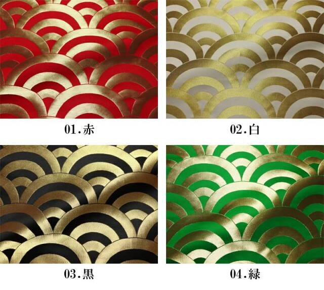 こちらの和柄生地は、赤色、白色、黒色、緑色、紫色、青色、新橋色(明るい緑がかった青色)の7色展開の織地の金襴生地です。どんなシーンでも使いやすい生地です。